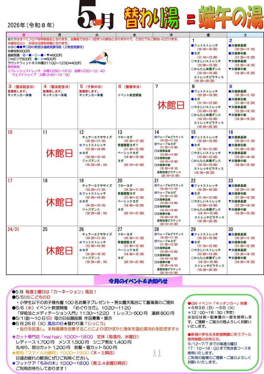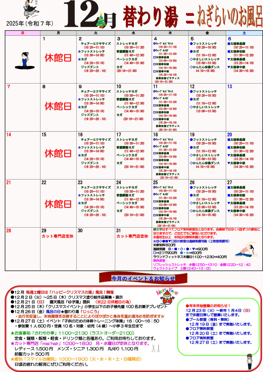 | 施設内容 | 温水プール、浴場、トレーニングルーム、お食事処 大広間、ミーティングルーム、和室、カット専門店、整体、売店 |